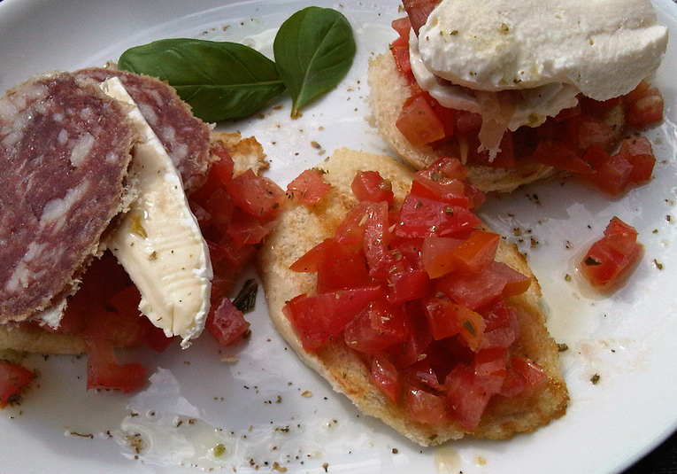 Szinte mindegy mi kerül ezekre a vastag kenyér szeletekre, lényeg, hogy jól megpirítsuk mindkét oldalát [elvégre nevében is ott van!- “bruschetta”-faszén felett pirított], fokhagymával megmasszírozzuk, és nyakon öntsük olíva olajjal.