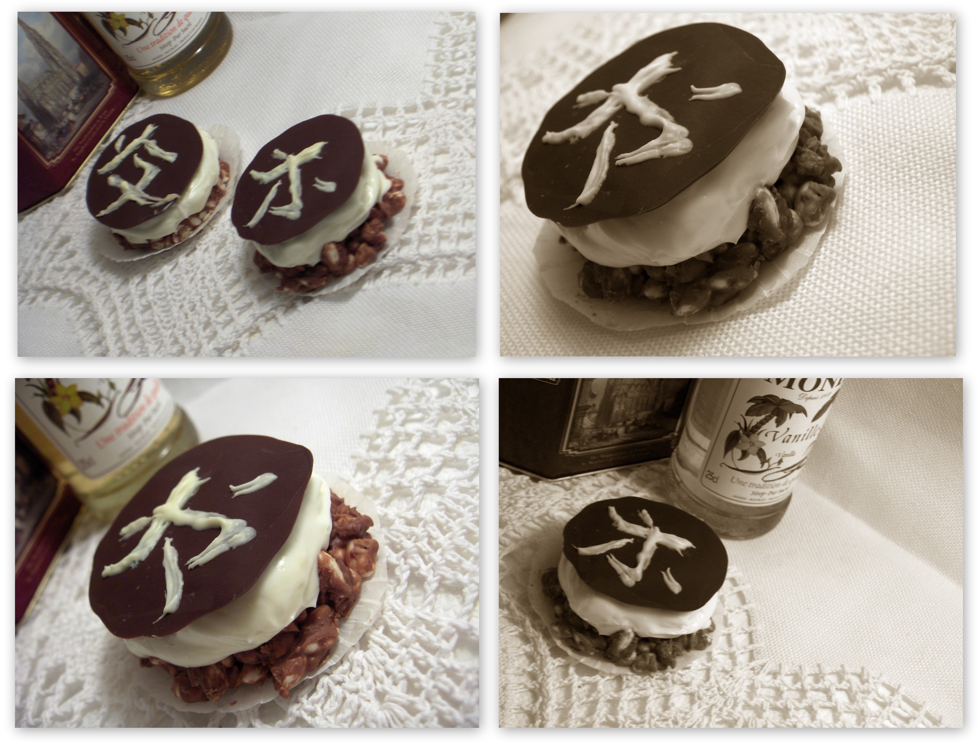 Ha már rizses csokoládéval indítottam és fehér csokit is olvasztottam, miért ne rajzoljak néhány japán krisz-kraszt a fekete csokoládé tallérokra?- gondoltam és gondolatom tett követte.