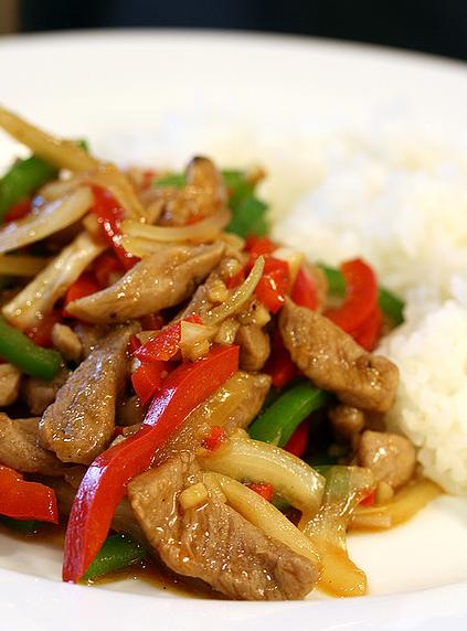 Kevés olajon üvegesre párolom a hagymát, hozzá adom a zúzott fokhagymát és rádobom a csíkokra vágott húst. Néhány percig pirítom, majd felöntöm alaplével (húsleves). Puhára párolom, majd hozzáadom a csíkokra vágott paprikákat és a kukoricát (módjával), majd kevés kukorica keményítővel éppen csak besűrítem.