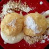 A hozzávalókat alaposan összedolgozom, majd egy órára hűtőben pihentetem. Enyhén sós vízben megfőzöm. Amikor már a víz felszínére jönnek szűrőkanállal kiveszem, és beleforgatom porcukorba majd megszórom pirított mandulával, mogyoróval.