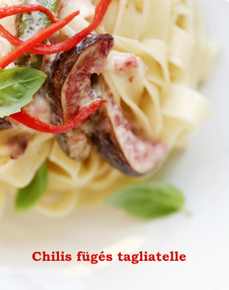 Hozzáadtam a kifőtt tésztához, megszórtam vékony csíkokra vágott chilivel és friss bazsalikomlevéllel.