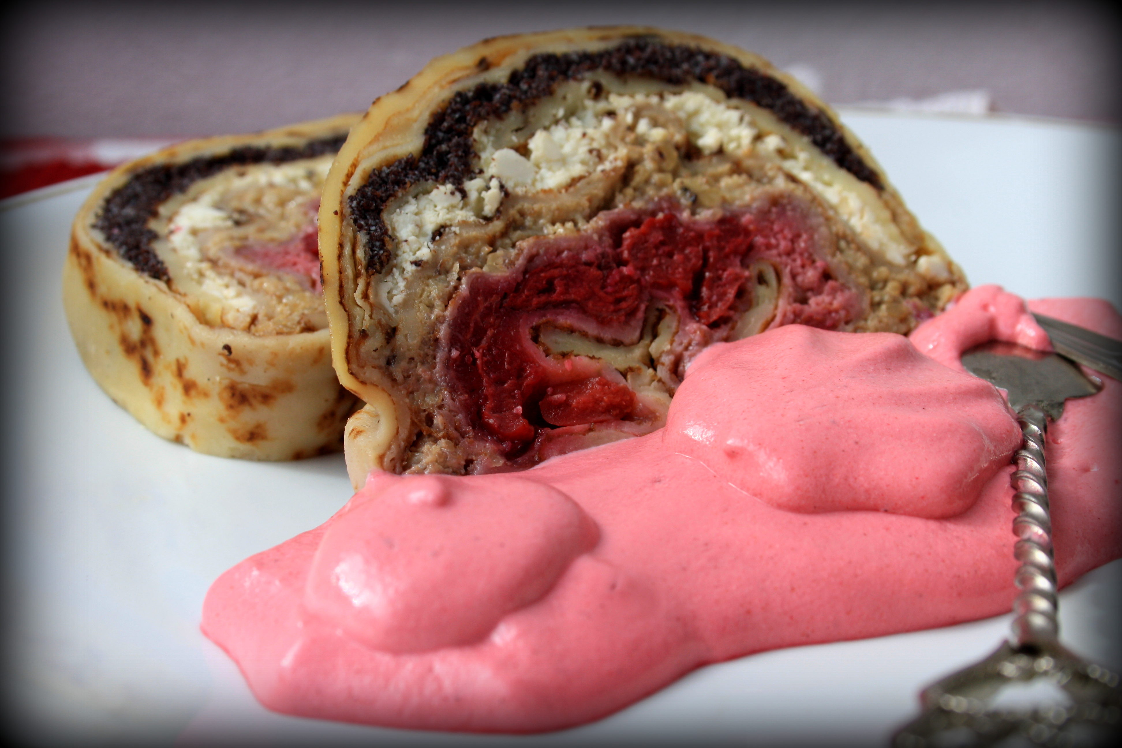 Megkenem a máktöltelék felével. Egy üres palacsintával befedem, erre a túrókrém felét simítom. Ezután ismét palacsinta rá a diókrém fele, majd palacsinta és a meggytöltelék fele kerül. A tetejére egy üres palacsintát fektetek.