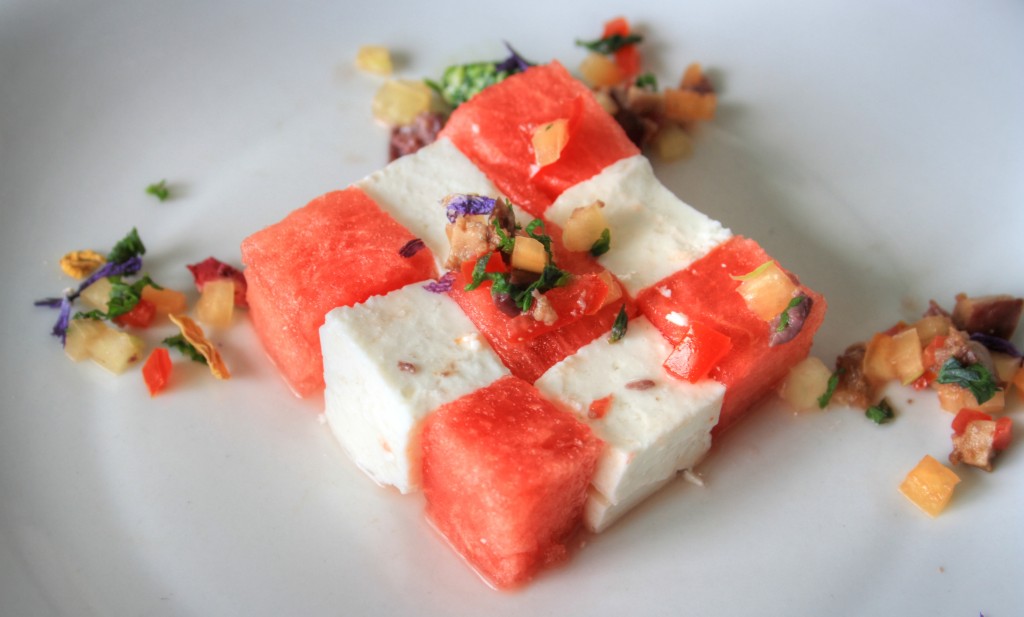 Behűtött kimagozott dinnyét és a feta sajtot falatnyi kockára vágom, néhány darab sárga és piros kaliforniai paprikát, olívabogyót egészen apróra vágok, apróra tépek pár húsos friss bazsalikom levelet az egészet összekeverem és a dinnye & feta kockákra dobom, kevés olívaolajjal meglocsolom és már lehet is fogyasztani.