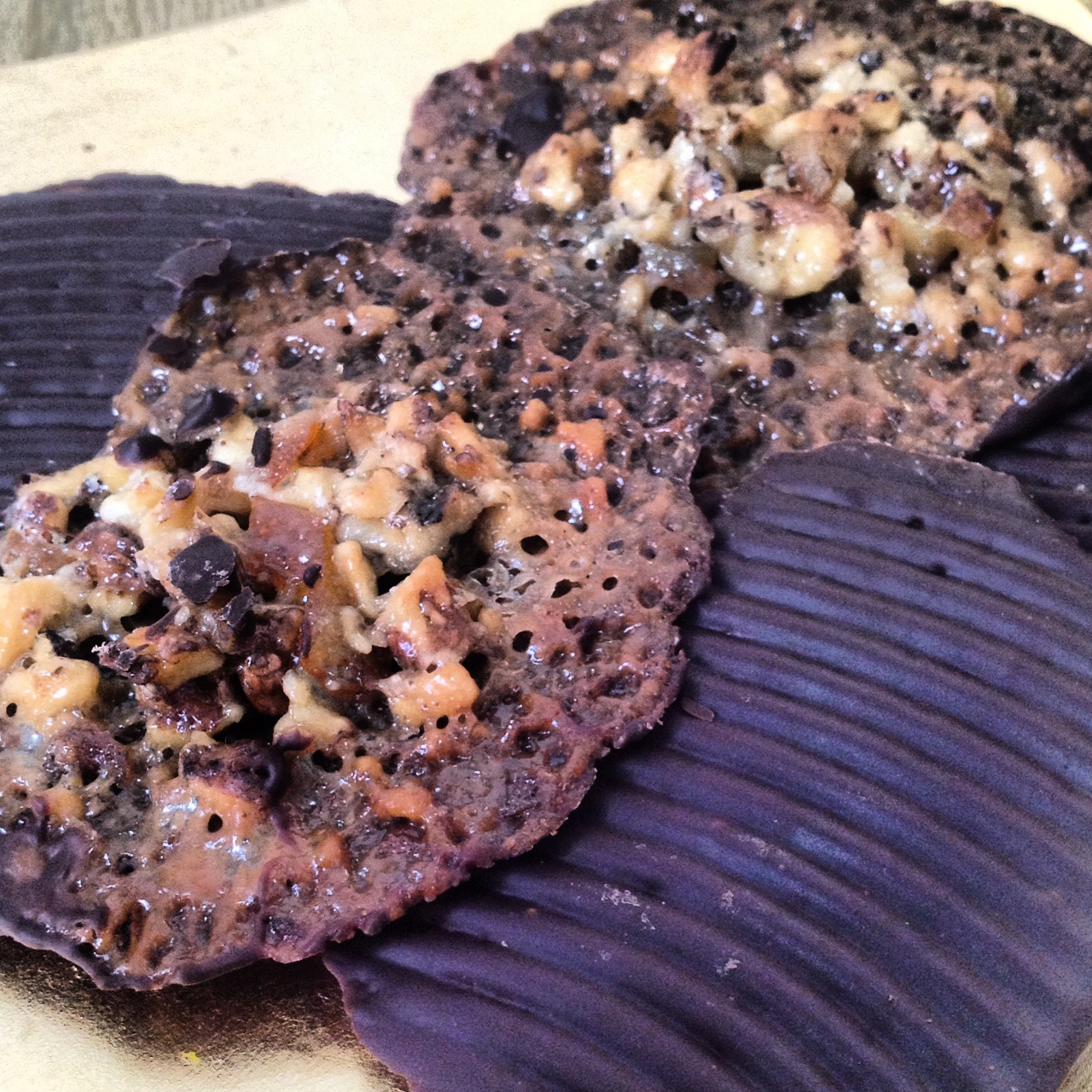 A kihűlt tallérokat olvasztott csokoládéba mártom és egy recés spatulával meghúzogatom.