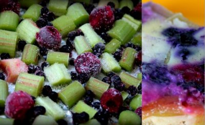 A tésztát kör alakú formához idomítottan kinyújtottam, kibéleltem vele, beleöntöttem a túrós masszát és ráhelyeztem a már kihűlt lecsöpögtetett rebarbarát.